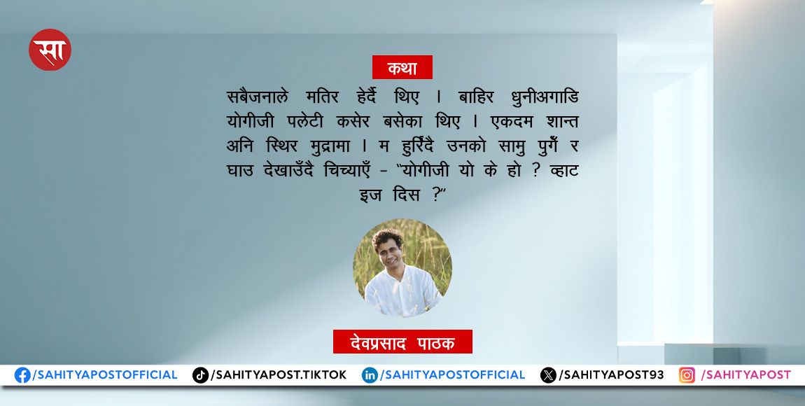 सबैजनाले मतिर हेर्दै थिए । बाहिर धुनीअगाडि योगीजी पलेटी कसेर बसेका थिए । एकदम शान्त अनि स्थिर मुद्रामा । म हुर्रिंदै उनको सामु पुगेँ र घाउ देखाउँदै चिच्याएँ – “योगीजी यो के हो ? व्हाट इज दिस ?”