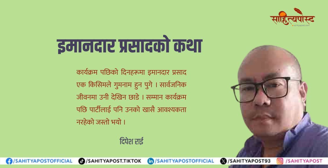 तालीको गडगडाहटमा इमानदार प्रसादलाई दोसल्ला ओढाइँदै गर्दा इमानदार प्रसादको मनमा उथलपुथल चल्दै थियो । पार्टीले कार्यक्रमको आयोजना इमानदार प्रसादको राजनैतिक जीवनमा उनले आजको दिनसम्म आत्मसात् गरेको इमानदारिताको सम्मान गर्नलाई गरेको थियो । राजनैतिक जीवनमा उनको आफ्नो अडान, इमानदारिता र उदारताले गर्दा पार्टीलाई चुनावमा जीत हासिल गर्न दह्रो सहयोग पुग्दै आएको थियो । उनको उदारता यति सम्म थियो की उनी भन्दा धेरै पछि राजनीतिमा छिरेकाहरू स्थानीय निर्वाचन हुँदै सांसद सम्म बनेका थिए । साधारण सदस्यबाट केन्द्रीय शक्तिशाली पदाधिकारी सम्मको यात्रा धेरैले तय गरिसकेका थिए । अरूलाई प्रोत्साहन गर्न आफू सिंढी बनिदिँदा उनी धेरै पटक आफै गजग्ग परेका थिए । त्यही भएर पार्टीको मुख्य आयोजकले उनलाई ओडाउने दोसल्ला पनि विना कमिसन किन्न विशेष आदेश नै दिएको थियो । भाषणको क्रम चल्दै थियो । मञ्चमा आसीन र इमानदार प्रसादको आज मुक्तकण्ठले गुणगान गर्ने सबैलाई उनले हेरे । घोक्रो सुकाइञ्जेल बोल्नेहरू देख्दा उनलाई एक किसिमको घृणा लागेर आयो किनकि उनीहरू सबैको शुरूआती जीवन, राजनीति, अहिलेको सुविधासम्पन्न जीवनशैली, रवाफ र त्यो भन्दा बढी उनीहरूको खोक्रो ओकलाइले उनलाई शून्यतामा लग्दै गयो । अरू बेला भाषण गर्दा समयको ख्याल नहुने उनी आज धन्यवादका दुई शब्द बोल्न पनि नसक्ने भए ।