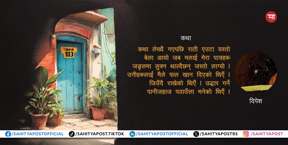 “अलि दिन । एउटा कथा सकेर जान्छु घर । मलाई कथाले अभर गर्यो । कि यो कोठाले हो ?”