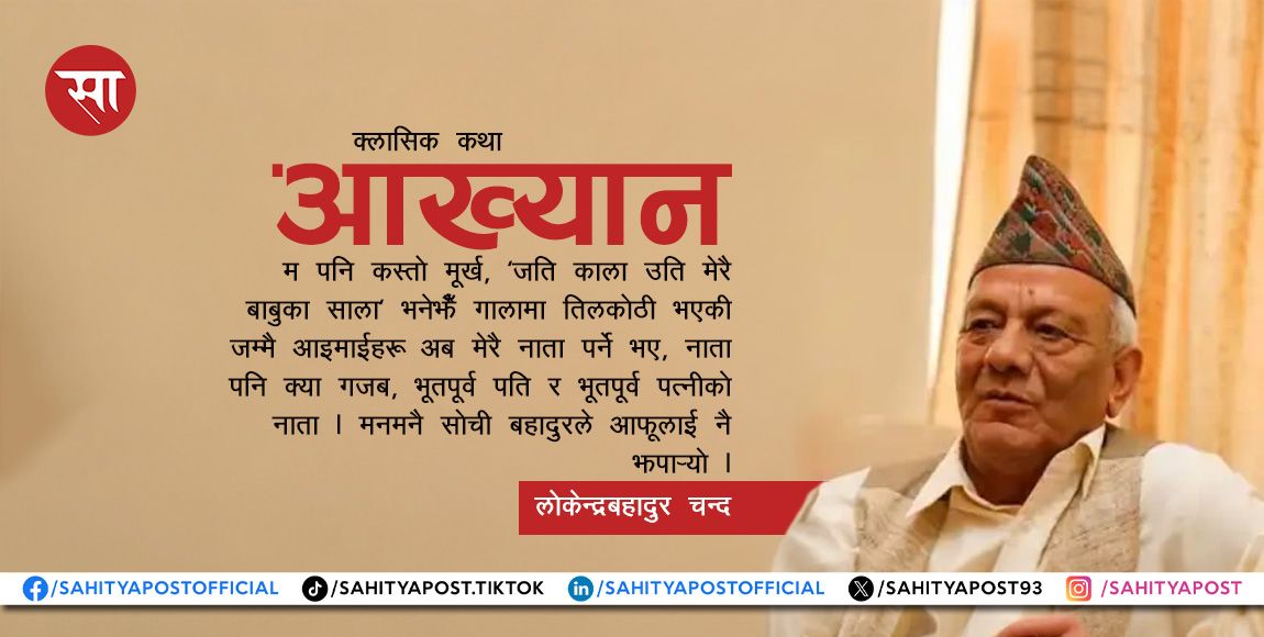 म पनि कस्तो मूर्ख, ‘जति काला उति मेरै बाबुका साला’ भनेझैँ गालामा तिलकोठी भएकी जम्मै आइमाईहरू अब मेरै नाता पर्ने भए, नाता पनि क्या गजब, भूतपूर्व पति र भूतपूर्व पत्नीको नाता । मनमनै सोची बहादुरले आफूलाई नै झपार्यो । तर ‘चिटिक्क परेकी राम्री त छिन्’ भन्ने विचारले पनि बीचबीचमा आक्रमण गर्दैरहेको थियो ।