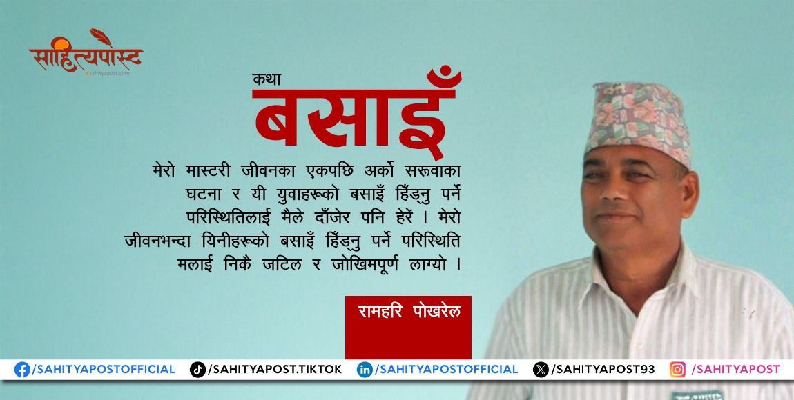 कमला हाई स्कूलको कक्षा आठमा पढ्ने मेरो पूर्व विद्यार्थीले आज यहाँ आउनुको कारण सबै सुनायो । उसका कुरा मैले पनि चाख मानेर सुनें । मेरो मास्टरी जीवनका एकपछि अर्को सरुवाका घटना र यी युवाहरूको बसाइँ हिँड्नु पर्ने परिस्थितिलाई मैले दाँजेर पनि हेरें । मेरो जीवनभन्दा यिनीहरूको बसाइँ हिँड्नु पर्ने परिस्थिति मलाई निकै जटिल र जोखिमपूर्ण लाग्यो ।
