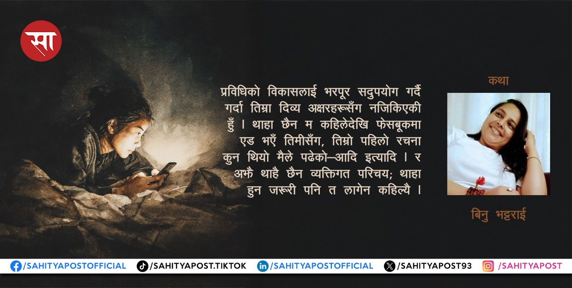 प्रविधिको विकासलाई भरपूर सदुपयोग गर्दै गर्दा तिम्रा दिव्य अक्षरहरूसँग नजिकिएकी हुँ । थाहा छैन म कहिलेदेखि फेसबुकमा एड भएँ तिमीसँग, तिम्रो पहिलो रचना कुन थियो मैले पढेको—आदि इत्यादि । र अझै थाहै छैन व्यक्तिगत परिचय; थाहा हुन जरूरी पनि त लागेन कहिल्यै । किनकि म प्रेम गर्छु तिमीभित्रको शक्तिलाई, जसले उस्तै–उस्तैको तालमेल मिलाइरहेछ, शब्दजाल बुन्ने शैलीले पछ्याइरहेछ । अक्सर विचारले चिटिक्क पोतिएकाहरू व्यवहारले छरपष्ट पनि भेटिन्छन्, मलाई मन पर्दैन बौद्धिक मान्छे छिरलिएको ।