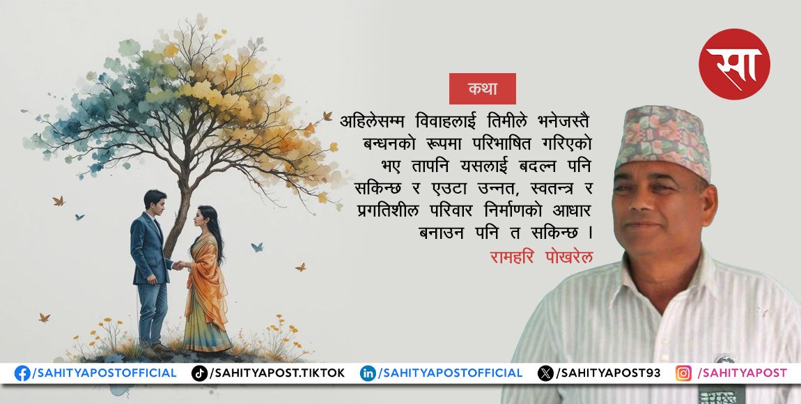 “होइन ।” मैले भनेँ – “ प्रेम पूर्णतः भावनामा आधारित हुन्छ— यो आकर्षण, माया, भरोसा, नजिकपन र स्वतन्त्र हुन्छ तर विवाह सामाजिक र कानुनी संस्थागत सम्बन्ध हो अनि परिवार, समाज र कानुनी बन्धन पनि ।”
