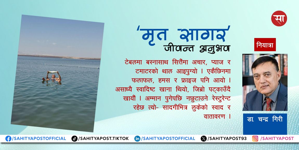 भएको के थियो भने, जब मैले मृत सागरको किनारमा पानीमाथि सुतेर, दुवै हातले नक्सा समातेर पढिरहेको फोटो मेरो फेसबुक पेजमा पोस्ट गरेँ, थरिथरिका प्रतिक्रियाहरू आउन थाले । कसैले ‘यो त प्रविधिको कमाल हो’ भने । कसैले ‘तल के राख्नुभएको थियो ?’ भनेर सोधे । अरूहरूले प्राविधिक जिज्ञासा राखे- यो कसरी सम्भव छ भनेर । कतिले ‘मैले सुनेको वा पढेको छु’ भने । अनि एक-दुई जनाले आफू पनि त्यहाँ पुगेको जानकारी गराए ।