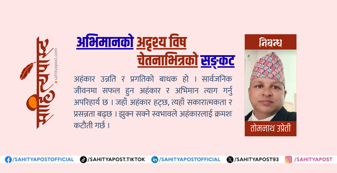 मानव चेतना सधैँ स्पष्ट र निर्मल रहँदैन । उपलब्धि, धन, पद, वा ज्ञानले भरिएको मन सहजै अहंकारतर्फ आकर्षित हुन्छ । जब कसैले सफलता पाउँछ, मन भन्छ– “म अरूभन्दा श्रेष्ठ छु ।” जब कसैले धन कमाउँछ, मन भन्छ– “मेरो शक्ति अरूलाई माथि चढाउँछ ।” जब कसैले ज्ञान पाउँछ, मन भन्छ– “म नै सबैभन्दा ज्ञानी हुँ ।” यी विचारहरू सुस्त–सुस्त चेतनाभित्र पस्छन् । अनि यही ‘सामान्य’ विचार कालान्तरमा अभिमानको अदृश्य विषमा रूपान्तरण हुन्छ ।