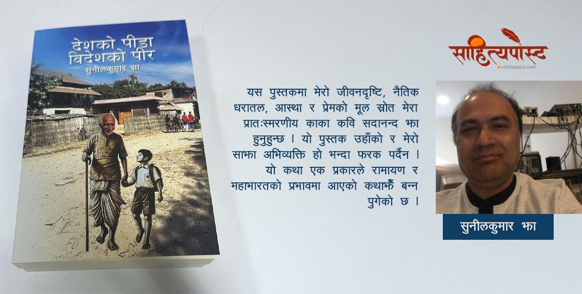 यस पुस्तकमा मेरो जीवनदृष्टि, नैतिक धरातल, आस्था र प्रेमको मूल स्रोत मेरा प्रातःस्मरणीय काका कवि सदानन्द झा हुनुहुन्छ । यो पुस्तक उहाँको र मेरो साझा अभिव्यक्ति हो भन्दा फरक पर्दैन । यो कथा एक प्रकारले रामायण र महाभारतको प्रभावमा आएको कथाझैँ बन्न पुगेको छ ।