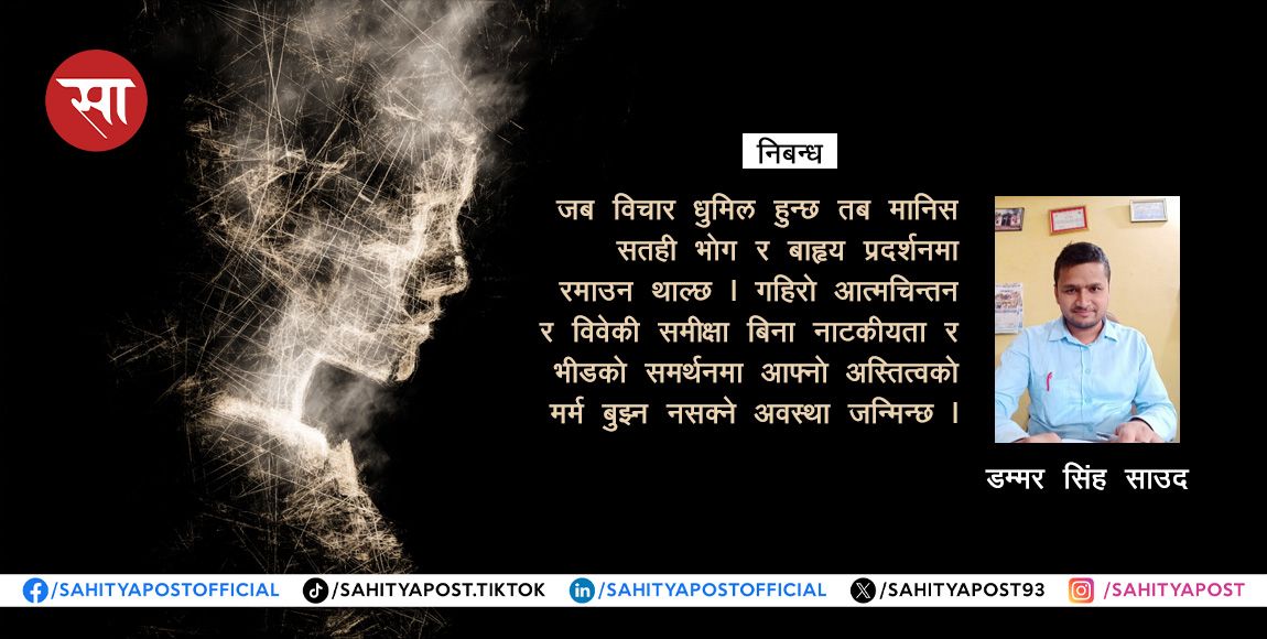 तर जब विचार धुमिल हुन्छ, मानिस सतही भोग र बाह्य प्रदर्शनमा रमाउने हुन्छ । गहिरो आत्मचिन्तन र विवेकी समीक्षा बिना नाटकीयता र भीडको समर्थनमा आफ्नो अस्तित्वको मर्म बुझ्न नसक्ने अवस्था जन्मिन्छ । यस्तो समाजमा साँच्चिकै जिउने कला लोप हुन्छ र केवल बाँच्छ भन्ने अवस्था आउँछ । त्यसैले आजको युगमा सोच्ने, विश्लेषण गर्ने र आत्मसमीक्षा गर्ने क्षमता विकास गर्नु सबैभन्दा महत्त्वपूर्ण जीवनकला हो, जसले हामीलाई सजीव र सशक्त बनाउँछ ।