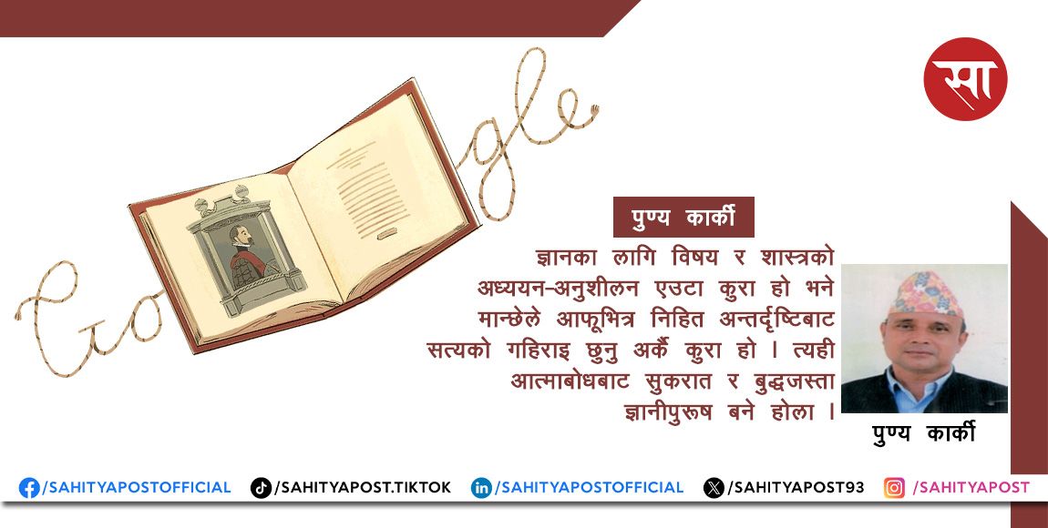ज्ञानका लागि विषय र शास्त्रको अध्ययन–अनुशीलन एउटा कुरा हो भने मान्छेले आफूभित्र निहित अन्तर्दृष्टिबाट सत्यको गहिराइ छुनु अर्कै कुरा हो । त्यही आत्माबोधबाट सुकरात र बुद्धजस्ता ज्ञानीपुरुष बने होला । किनभने यी पुरुषहरूले आर्जन गरेको ज्ञान कुनै विश्वविद्यालयका पोथा पल्टाएर या प्राध्यापकको लेक्चर सुनेर आर्जन गरेको ज्ञान थिएन । त्यसैले ज्ञान भन्ने चिज ज्ञानका नितान्त औपचारिक स्रोतहरूमा पौडी खेलेरमात्र प्राप्त हुन्न । यी आँखाले ज्ञानका अनौपचारिक स्रोतहरू पनि देख्नसक्नु पर्छ । प्रविधिले हामीलाई खदेड्दै खदेड्दै त्यहाँ लगिसक्यो जहाँ महीना दिनमा अध्यापकले पढाएर पिलाउने ज्ञान च्याट जिपिटी र डिपसिकले पाँच मिनेटमा पिलाउने विधि ल्याइसक्यो । गुगल आउनु अघि ज्ञान देशीय थियो, महादेशीय थियो । भूगोलका सीमा रेखाले ज्ञानलाई एउटा एउटा वृत्तमा सीमित गरेको थियो । एउटा एउटा परिधिमा खुम्च्याइबसेको थियो । तर, गुगलले भूगोल छिचल्यो । अहिले ज्ञान कुनै सीमारेखामा कैदी छैन । यो विश्वजनित पखेटा उचालेर हावामा उडिरहेको छ । गुगल इन्टरनेटको आविष्कारले ज्ञानलाई सीमाहिन बनायो ।