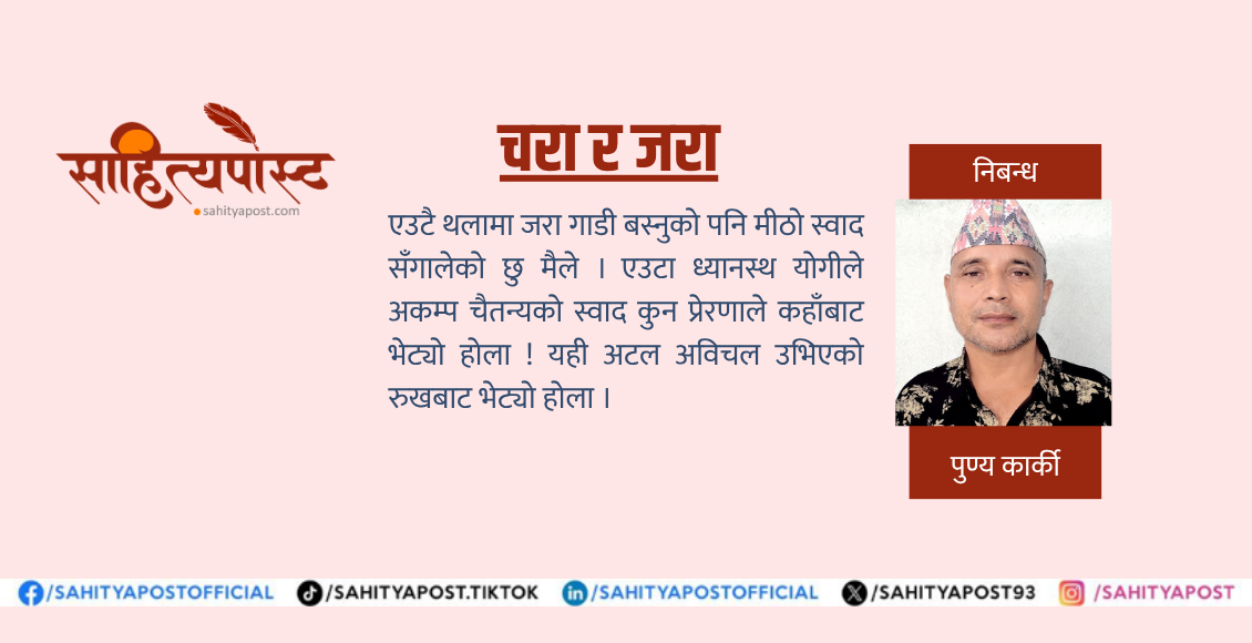 एउटै थलामा जरा गाडी बस्नुको पनि मीठो स्वाद सँगालेको छु मैले । एउटा ध्यानस्थ योगीले अकम्प चैतन्यको स्वाद कुन प्रेरणाले कहाँबाट भेट्यो होला ! यही अटल अविचल उभिएको रुखबाट भेट्यो होला । अर्को प्रश्न आफैँलाई सोध्छु– तँलाई बिना हलचलको निस्तरङ्ग शान्ति कहाँबाट मिल्यो ? भित्रबाट जवाफ पाउँछु– तँ भित्रको तपस्वी जराबाट । हो मभित्रको जरालाई बाहिरी संसार हेर्नुमा कुनै रुचि र रस छैन । मभित्रको जरालाई बाहिरी जगत् शयर गर्नु, यसको चमकदमक पछि दौडनुको कुनै रहर छैन । म त भित्रभित्रै ध्यानस्थ स्थितिमा सृजन–मस्तीमा डुब्न चाहन्छु, जुन कारणबाट होइन, अकारण घटित होस्, जुन विचारबाट होइन, अनिर्विचार स्थितिबाट जागृत होस्, जसमा जराको ध्यान र चरा गान अनि उडान साथसाथै सम्मीलन होस् । जरा र चरा दुवैको जय होस् ।