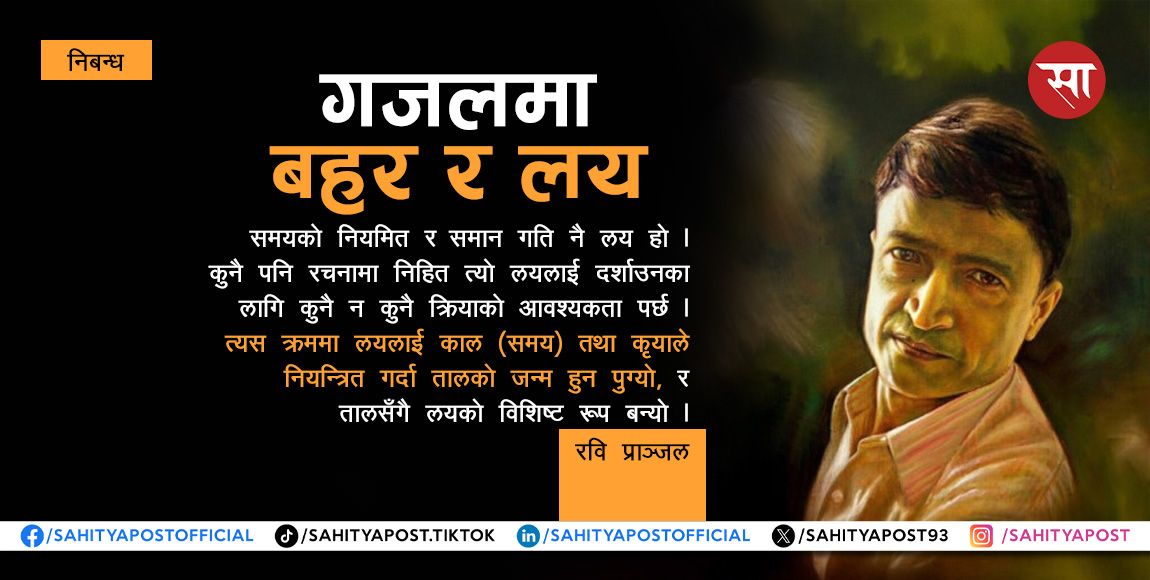 माथि नै भनियो, गीत वा गजलको मूलमै सङ्गीत निहित हुन्छ । सङ्गीत भन्नेबित्तिकै त्यहाँ लय हुने नै भयो ।