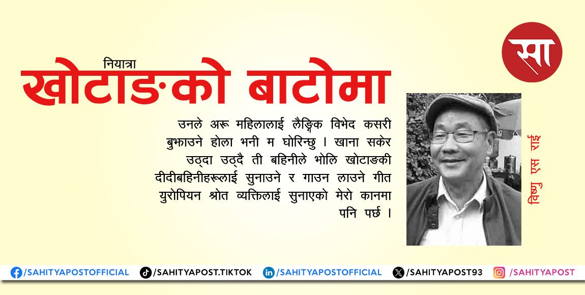 रखाना सकेर उठ्दाउठ्दै ती बहिनीले भोलि खोटाङकी दिदीबहिनीहरूलाई सुनाउने र गाउन लाउने गीत युरोपियन स्रोत व्यक्तिलाई सुनाएको मेरो कानमा पनि पर्छ । गीतबारे युरोपियनको मन्तव्यलाई नपर्खी म आफ्नो रुकस्याक उचालेर पिठ्युँमा राख्छु, र होटल माल्किनीलाई पैसा तिरेर बिस्तारै उकालो लाग्छु । भावनाका तरङ्गहरू मेरो मनमा समुद्रमा छाल उठेझैँ उठन थाल्छ र मेरो मनले कविता बुन्न थाल्छ–