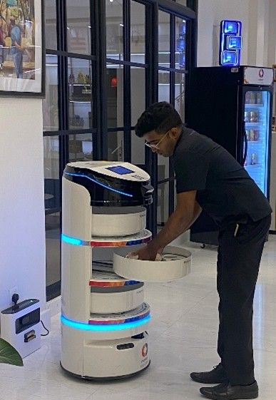 म उसको अगाडि गएँ र ट्रे खोल्न खोजें‚ खुलेन। मैले उसको माथिल्लो भागमा रहेको डिस्प्लेमा एक दुईपटक टच गरेँ। पछि कुनै तरिकाले ट्रे खुल्यो‚ यद्यपि त्यो प्रोग्राम अनुरुप (नियम संगत) थिएन। मैले खानेकुरा निकालें र ढोका खोलेर कोठामा राखें। मलाई खानेकुरा जतनसँग राख्नुभन्दा पनि रोबोट फर्केको पनि हेर्नु थियो। त्यसैले मेरो ध्यान रोबोटमाथि नै केन्द्रित थियो। हतार हतार खाना कोठाको कुनै कुनामा छोडेर म उसको हरकत हेर्नतिरै लागें।
