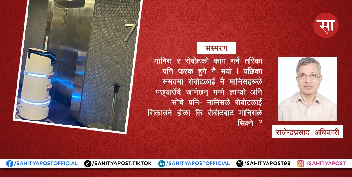 सातौं तलामा आएर लिफ्टको ढोका खुलेपछि‚ फेरि आवाज आयो- “दि एलिभेटर इज एराइभ्ड‚ एन्टर दि एलिभेटर”‚ रोबोट आफ्नो शरीर मिलाउँदै लिफ्टभित्र पस्यो। लिफ्टको ढोका बन्द भयो। म बल्ल होसमा आएँ। कोठामा खाना कस्तो अवस्थामा होला भन्ने सोच्दै कोठातिर लागेँ। रोबोटको गतिविधि नियाल्ने क्रममा कोठा खोल्ने कार्ड भित्रै परेछ। फेरि तल रिसेप्सनमा गएर भनें। मास्टर कि लिएर ढोका खोलिदिए। “तपाईंहरूलाई धेरै दुःख दिएँ है मैले‚ सरी” भनें र रोबोटले डेलिभर गरेको खाना खान थालेँ। मानिसलाई आर्टिफिसियल इन्टेलिजेन्स (एआई) र रोबोट प्रविधिसँग आत्मसात गर्दै धेरै अगाडि बढ्नु पर्ने नै छ। कतिपय देशमा त ड्राइभर विनाका गाडीहरू चल्न थालिसकेको यो समयमा हाम्रो देशका जनतालाई छिटोभन्दा छिटो यस्ता प्रविधिसँग साक्षात्कार एवम् अभ्यस्त गराउने कसरी होला भन्ने सोचाइले भने लामो समयसम्म मलाई बिथोलिरह्यो‚ मलाई पिरलिरह्यो।