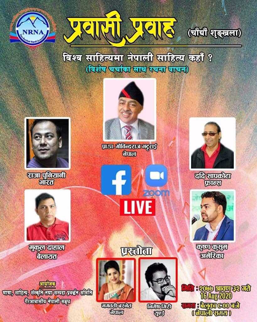 गैरआवासीय नेपाली सङ्घको भाषा, साहित्य , संस्कृति तथा सम्पदा समितिको आयोजनामा “प्रवासी प्रवाह” को चौधौ शृङ्खला समापन भएको छ । अनलाइनमार्फत् गरिएको उक्त कार्यक्रम “विश्व साहित्यमा नेपाली साहित्य कहाँ ?” विषयक विमर्शका साथ समापन भएको हो ।