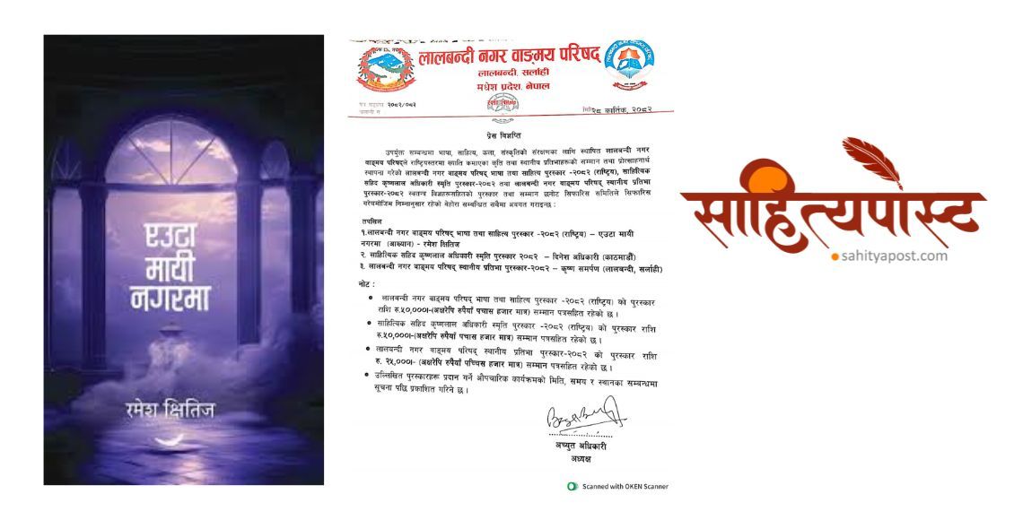 सर्लाही । लालबन्दी नगर वाङ्मय परिषद्, लालबन्दीले ‘लालबन्दी नगर वाङ्मय परिषद् भाषा तथा साहित्य पुरस्कार–२०८२’ साहित्यकार रमेश क्षितिजको आख्यान ‘एउटा मायी नगरमा’ लाई प्रदान गर्ने निर्णय गरेको छ।