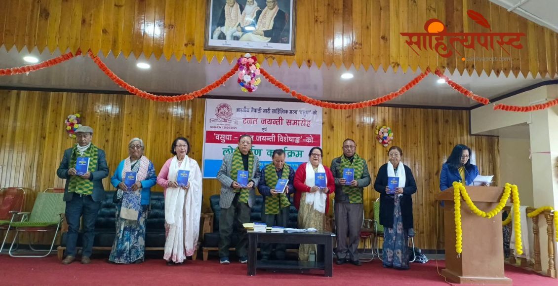 दार्जिलिङ । बसुधा भारतीय नेपाली नारी लेखिका मञ्चको आयोजनामा रजत जयन्ती समारोह दार्जिलिङमा भव्य रूपमा सम्पन्न भएकाे छ । सोही अवसरमा ‘वासुधा रजत जयन्ती विशेषाङ्क’ कृतिको लोकार्पण समेत गरिएको थियो। मञ्चका अध्यक्ष डा. गीता क्षेत्रीको अध्यक्षतामा सम्पन्न समारोहमा साहित्यकार डा. गोकुल सिन्हा प्रमुख अतिथिका रूपमा उपस्थित रहनुभएकाे थियाे ।