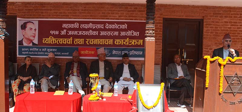 काठमाडौँ, कात्तिक ४ / नेपाल प्रज्ञा–प्रतिष्ठानद्वारा महाकवि लक्ष्मीप्रसाद देवकोटाको ११४औँ जन्मजयन्तीका अवसरमा महाकवि देवकोटाको व्यक्तित्वचर्चा तथा रचनावाचन कार्यक्रम आयोजना गरियो । प्रज्ञा–प्रतिष्ठानका निमित्त कुलपति डा. जगमान गरुङको अध्यक्षता र निवर्तमान कुलपति गङ्गाप्रसाद उप्रेतीको प्रमुख आतिथ्य रहेको कार्यक्रम पहिलो पटक महाकवि लक्ष्मीप्रसाद देवकोटा सङ्ग्रहालय, मैतीदेवीमा आयोजना गरिएको हो ।