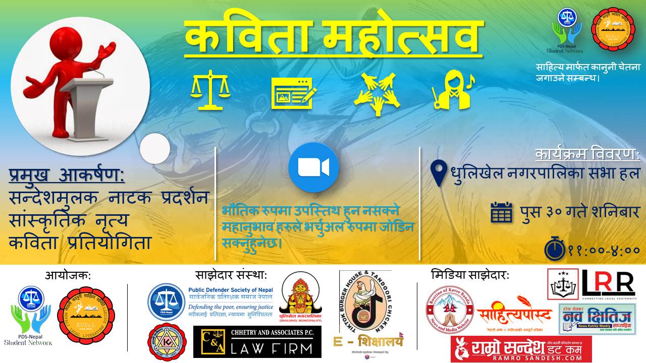 काठमाडौँ विश्वविद्यालय स्कुल अफ ल का विद्यार्थीद्वारा संचालित नेपाली कानुनी साहित्य समितिले पिडिएस नेपाल विद्यार्थी सञ्जालसँगको सहकार्यमा राष्ट्रिय कविता महोत्सव-२०७९ आयोजना गरेको छ।