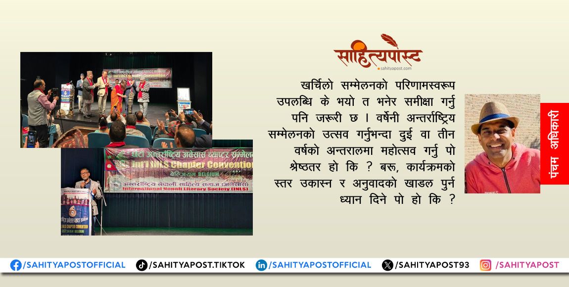 प्रतिकूल माउदेश र परदेशको परिस्थितिका बाबजूद पनि अनेसासका अध्यक्ष सर्वज्ञ वाग्लेले कार्यक्रम सफलतापूर्वक सम्पन्न गर्न देखाएको सटीक संयोजनलाई साधुवाद भन्नै पर्छ । अनि, बेल्जियम शाखाले ९ वर्षको अन्तरालमा अनेसासको अर्को अन्तर्राष्ट्रिय साहित्यिक सम्मेलन सम्पन्न गरेर आफ्नो विरासतलाई फेरि एक पटक पुष्टि गरेको छ ।