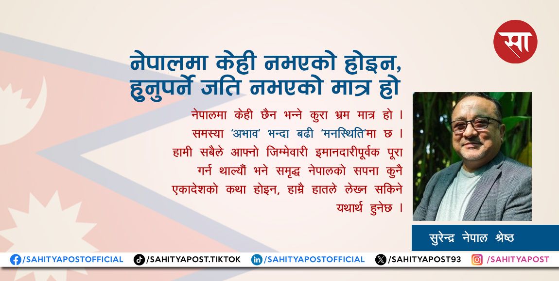 नेपालमा केही छैन भन्ने कुरा भ्रम मात्र हो । समस्या ‘अभाव’ भन्दा बढी ‘मनस्थिति’मा छ । हामी सबैले आफ्नो जिम्मेवारी इमानदारीपूर्वक पूरा गर्न थाल्यौं भने समृद्ध नेपालको सपना कुनै एकादेशको कथा होइन, हाम्रै हातले लेख्न सकिने यथार्थ हुनेछ ।
