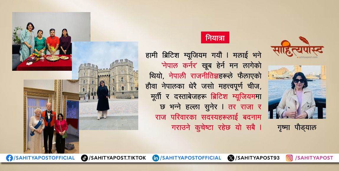 सोमबार भाइ फेरि मलाई लन्डन डुलाउन लिन आयो, त्यो दिन हामी ब्रिटिश म्यूजियम गयौं । मलाई भने ‘नेपाल कर्नर’ खूब हेर्न मन लागेको थियो, नेपाली राजनितीज्ञहरूले फैलाएको हौवा नेपालका धेरै जसो महत्वपूर्ण चीजबीज, मूर्ती र दस्तावेजहरू ब्रिटिश म्यूजियममा छ भन्ने हल्ला सुनेर । तर राजा र राज परिवारका सदस्यहरूलाई बदनाम गराउने कुचेष्टा रहेछ यो सबै । यस्तो अफवाह चलाउनेलाई त केही सजाय दिनु पर्ने हो, आफ्नै देशको बेइज्जत गर्ने बदमासहरू । ब्रिटिश म्यूजियममा त्यस्तो महत्वपूर्ण नेपालको सामाग्रीहरू केही थिएन । तीन बजेपछि कृष्ण बजगाँइ दाइ मलाई भेट्न आउनुभयो र केहीबेर संग्राहलय अवलोकन गरी बाटोमा चियाकफी सँगै पिई हामी छुट्टियौं र म १८८ नम्बरको बस चढी एक्लै ड्रुड स्ट्रिट स्फटेशनसम्म फर्किएँ । ३ मिनेट पैदल हिंडेर घर ।