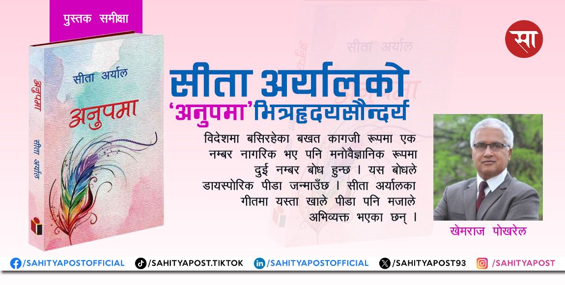 मैले गीतकार सीता अर्याललाई भौतिक रूपमा देखे/भेटेको छैन । तर मेरा सहकर्मी मित्र साहित्यकार राजेन्द्र अर्याल उनको पति भएकाले पनि नजिकिएको छु । भलीभाँती परिचित छु । विशेषगरी साहित्य साधनाका सन्दर्भमा भने उनको कथाकार व्यक्तित्वसँग झन् परिचित छु । तर ‘अनुपमा’ गीतसंग्रह भएकाले यति बेला म सीता अर्यालको गीतकार व्यक्तित्व तथा कृतित्वका बारेमा केही हरफ लेख्ने धृष्टता गर्दैछु । उनका गीतमा पाइएका हृदयसौन्दर्यमा पल्लवित हुने मेरो जुराइ रहेको छ ।
