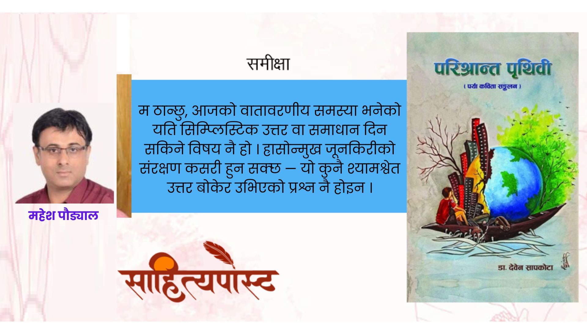 यो कुरा महत्त्वपूर्ण किन छ, त्यसको कारण छ । गायावादी भनिने एक थरी चिन्तक भन्छन्— मान्छेले रौँ पनि बिगर्न सक्दैन धरतीको । उनी त, अजन्मा, अविनाशी । आफैँ बौरिने, आफैँ उठ्ने । अर्कातिर छन् प्रलयवादी । ती भन्छन्— प्रलय त अवश्यंभावी छ, र मान्छेले प्रलयको मिति नजिक नजिक तानिरहेको छ । गायावादीको तर्कले सान्त्वना त दिन्छ, तर बढो आदर्शवादी लाग्छ । प्रलयवादी बढी व्यवहारिक छन् कि भन्ने लाग्छ । कवि सापकोटोको मत पनि त्यैतिर लेखिन्छ । नत्र उनले धरतीलाई ‘अविश्रान्त’ नदेख्नुपर्ने । होइन र?