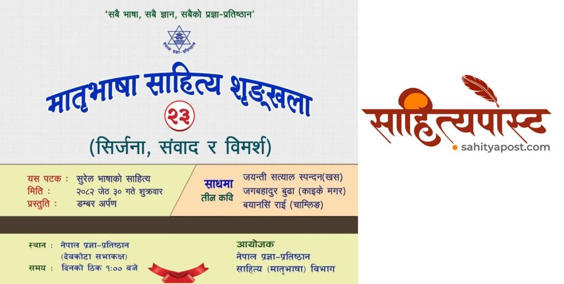 पूरै पढ्नुहोस् →काठमाडौं । नेपाल प्रज्ञा–प्रतिष्ठान अन्तर्गत साहित्य (मातृभाषा) विभागद्वारा आयोजित २३औं मातृभाषा साहित्य शृङ्खला शनिबार प्रतिष्ठानको कक्षमा सम्पन्न भएको छ। कार्यक्रमको...