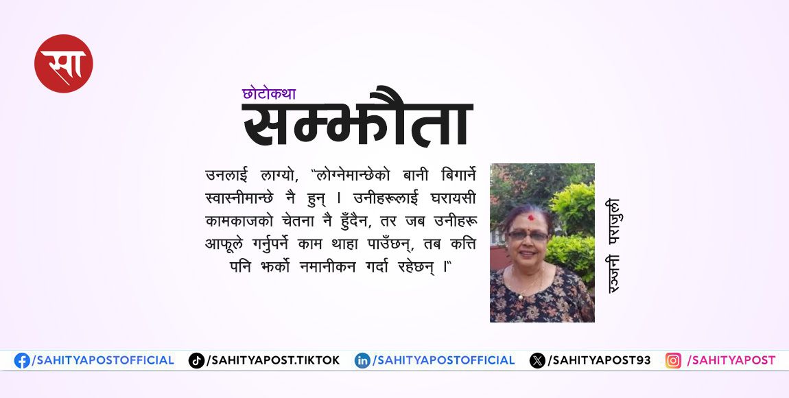 पूरै पढ्नुहोस् →उनलाई लाग्यो, “लोग्नेमान्छेको बानी बिगार्ने स्वास्नीमान्छे नै हुन् । उनीहरूलाई घरायसी कामकाजको चेतना नै हुँदैन, तर जब उनीहरू आफूले गर्नुपर्ने...