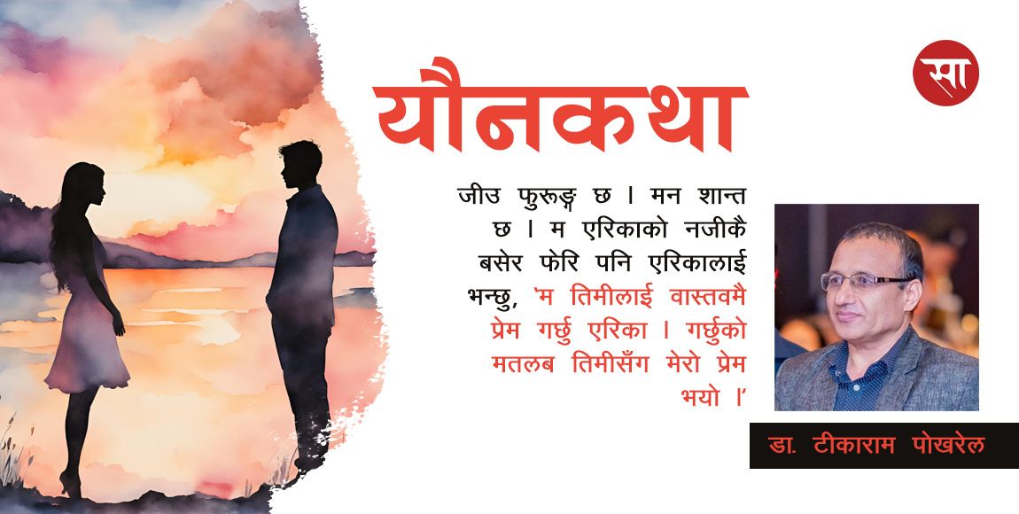 पूरै पढ्नुहोस् →जीउ फुरुङ्ग छ । मन शान्त छ । म एरिकाको नजीकै बसेर फेरि पनि एरिकालाई भन्छु, ‘म तिमीलाई वास्तवमै प्रेम...