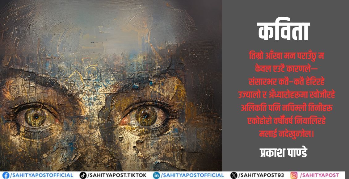 पूरै पढ्नुहोस् →सबभन्दा पहिला मैले तिम्रो आँखालाई हेरेँ। त्यहाँभित्र मेरो हृदयमा फुलेको गुलाब देखेँ, रोमान्चित भएँ। कलात्मक प्रकृतिले बनेका तिम्रा नीला आँखा...