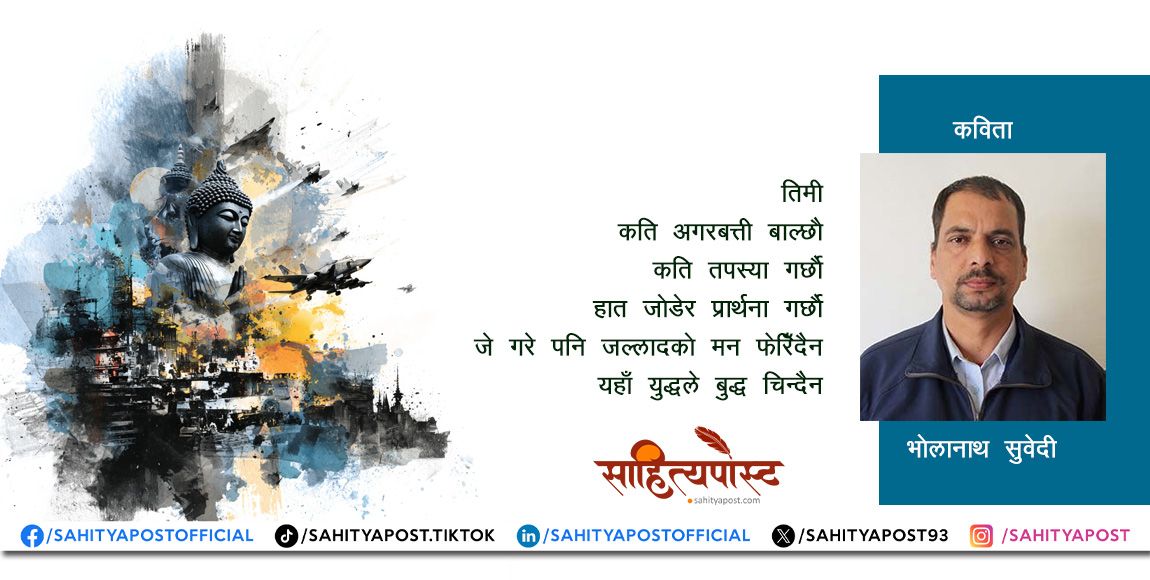 तिमी कति अगरबत्ती बाल्छौ कति तपस्या गर्छौ हात जोडेर प्रार्थना गर्छौ जे गरे पनि जल्लादको मन फेरिँदैन यहाँ युद्धले बुद्ध...