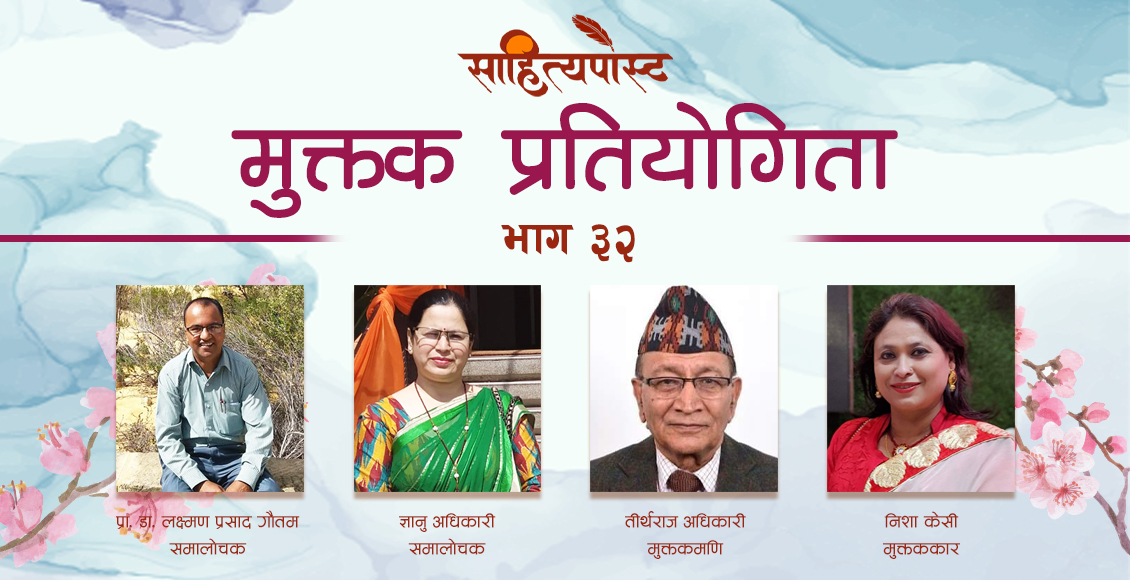 पूरै पढ्नुहोस् →साहित्यपोस्ट विद्युतीय पत्रिकाको खुला मुक्तक प्रतियोगिताको बत्तीसाैँ संस्करणमा लाहुराम चाैधरी, बाबुराम खपाङ्गी र अनुपम शर्मा सर्वोत्कृष्ट मुक्तककारका रूपमा चयन हुनुभएकाे छ...