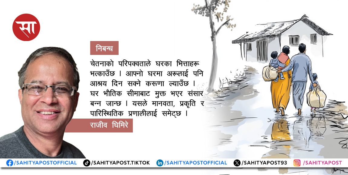 पूरै पढ्नुहोस् →चेतनाको परिपक्वताले घरका भित्ताहरू भत्काउँछ । आफ्नो घरमा अरूलाई पनि आश्रय दिन सक्ने करुणा ल्याउँछ । घर भौतिक सीमाबाट मुक्त...
