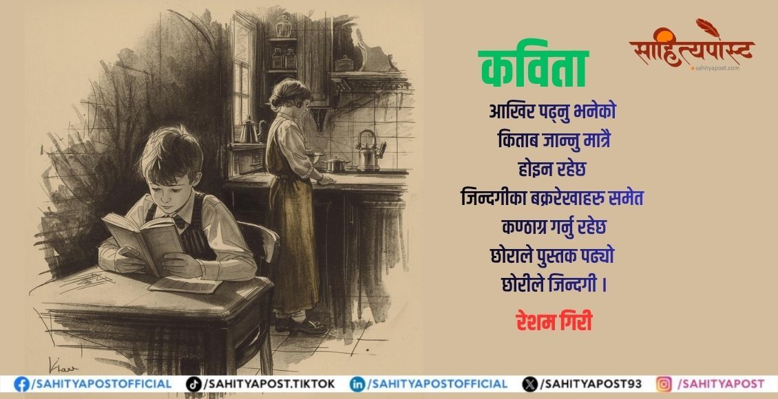 पूरै पढ्नुहोस् →मैले मेरो छोरालाई पढ पढिदिए पुग्छ भन्दाभन्दै उसले पढिदियो पुस्तकका पानापाना र गरिदियो कण्ठाग्र पाना भित्रका शब्दशब्द ल्याइदियो उसको अन्तिम...