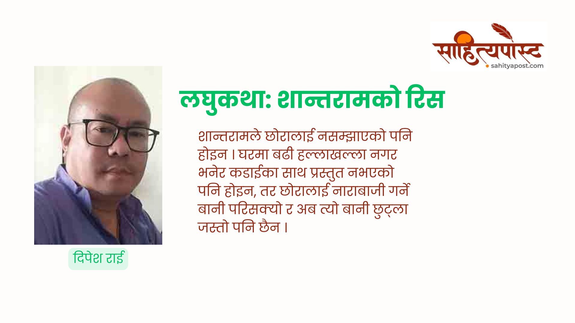 पूरै पढ्नुहोस् →शान्तराम केही दिन देखि तनावमा छ । अशान्त छ । उसको कक्षा ५ मा पढ्ने छोरो भ्रष्टाचारको विरोधमा नाराबाजी गर्ने...