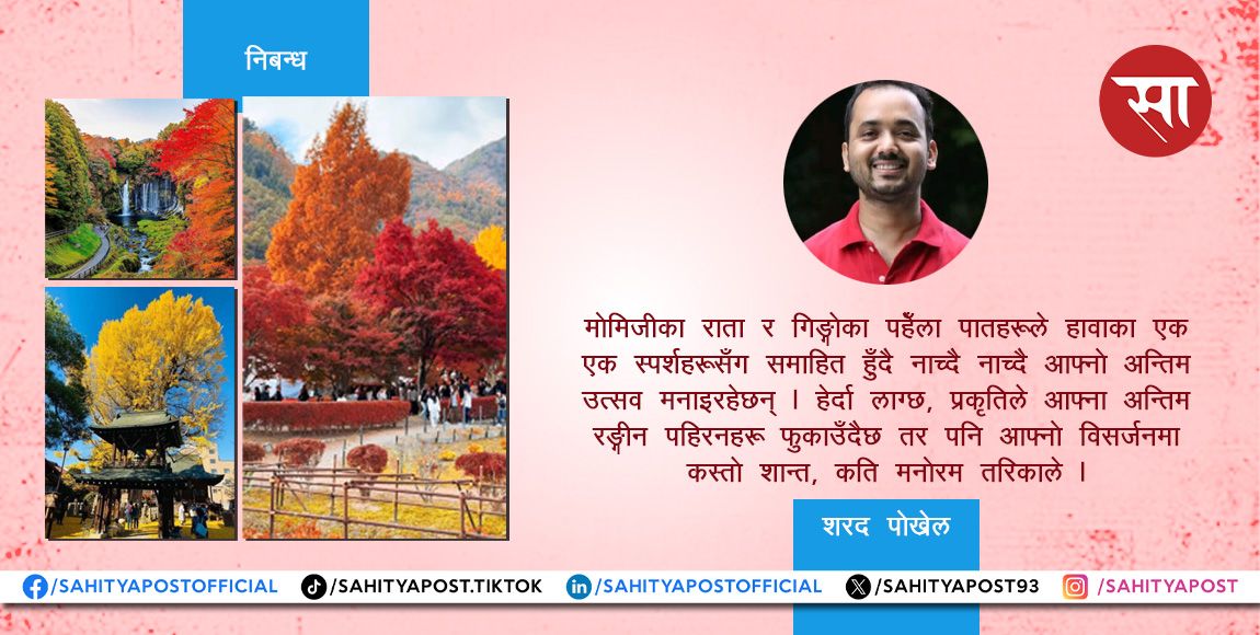 पूरै पढ्नुहोस् →जापानमा शरद ऋतुको अन्तिम दिनहरू निकै सुन्दर र मोहक लाग्ने गर्छन् । पूरै जङ्गल नै कुनै कलाकारको जादूयी कलाजस्तो देखिन्छ...