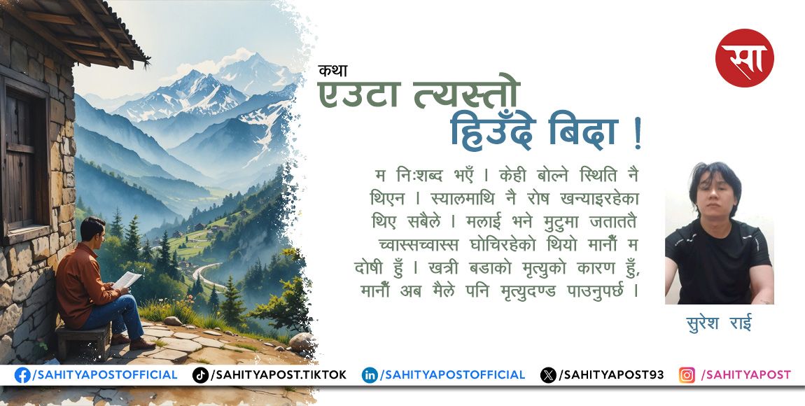 पूरै पढ्नुहोस् →रातभर मानवले घरमा रडाको मच्चायो । मोबाइल पछार्यो । दराजमा मुड्की बजार्यो । घरको सबैभन्दा ठूलो ऐना पनि फुटाल्यो ।...
