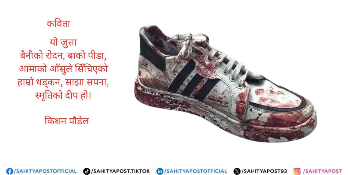 पूरै पढ्नुहोस् →यो जुत्ता बैनीको रोदन, बाको पीडा, आमाको आँसुले सिँचिएको हाम्रो धड्कन, साझा सपना, स्मृतिको दीप हो। रगतले भिजेको यो जुत्ताले...