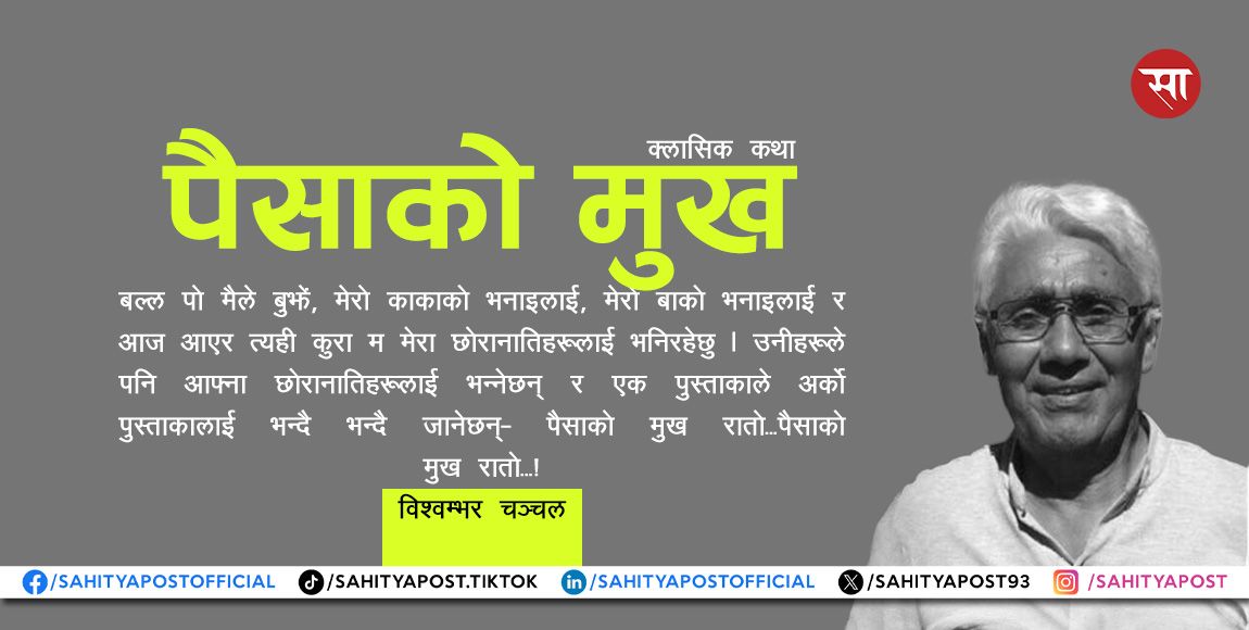 पूरै पढ्नुहोस् →केटाकेटी नै थिएँ । काका सधैं सोध्नुहुन्थ्यो, “तले पैसाको मुख देखेको छस् बाबु ?” “छैन काका ।” भन्थें र कहाँनेर...