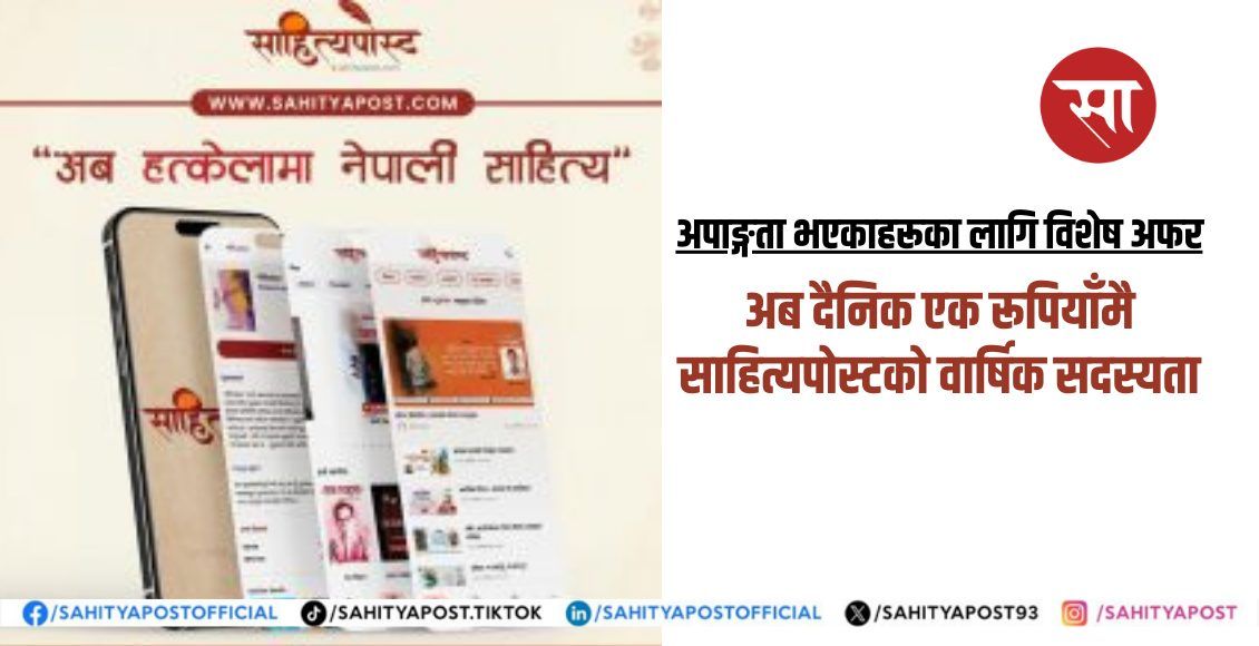 पूरै पढ्नुहोस् →अन्तर्राष्ट्रिय अपाङ्गता दिवसको अवसरमा साहित्यपोस्ट डटकमले अपाङ्गता भएका व्यक्तिहरूका लागि विशेष सदस्यता अफर सार्वजनिक गरेको छ । अफर सार्वजनिक गर्दै...