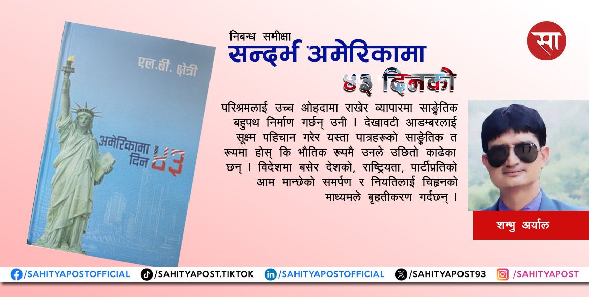 पूरै पढ्नुहोस् →“अमेरिकामा ४३ दिन”का लेखक एल.बी. क्षेत्री हुन् । उनी मेरा अभिभावक पनि हुन् । यसो भनिरहँदा उनी मेरा इष्टमित्र होइनन्...