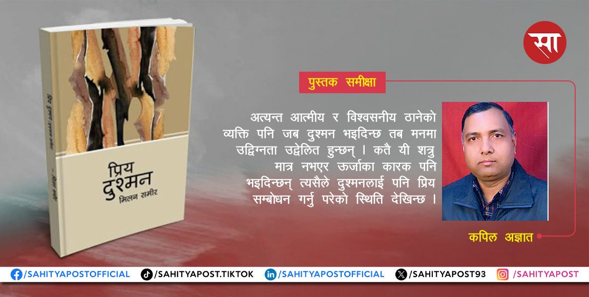 पूरै पढ्नुहोस् →प्रिय दुश्मन (२०७९) युवाकवि मिलन समीरको शृङ्खलाबद्ध कविता कृति हो । एउटै विषयलाई केन्द्र बनाएर यसरी एकतीसवटा शृङ्खला उन्न सक्नु...