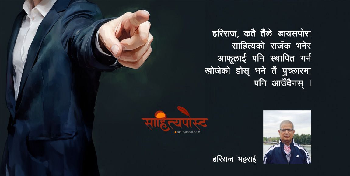 प्रोफेसर कृष्ण गौतमको नाम सुन्याछस् ? सबैभन्दा पछि अर्थात् सन् २००५ मा आजभन्दा झण्डै १८ वर्ष पहिले प्रोफेसर गौतमले डायसपोरिक साहित्यबारे चर्चा गरेका हुन् । यसअघि क–कसले यसबारे चर्चा गरे त्यसको पनि ऐतिहासिक मूल्य रहनेछ । तँ पनि वेलावेला बौलाउँछस् । तेरो आवेग र आक्रोशले धेरैलाई अप्ठेरोमा पार्छ । तलाईं यो चेतावनी पनि हो – चिन्तन नगरी सिर्जना परिपक्व हुँदैन । यदि यस्तै थाङ्ने कुरा लेखेर उचाइँ छुन्छु भन्छस् भने म तँलाई सिधै भन्छु– कलम भाँच र कसैको झोले बन् । यदि प्रभुको द्वारमा उपस्थिति दिएर बाँचेको ठहर्छ र सिध्दि मिल्छ भने त्यसै गर । त्यसैले यो खबरदारी हो तेरा लागि, छाडा न हो । सावधान हरिराज ! तैंले आरोप मुक्त हुनैपर्छ ।