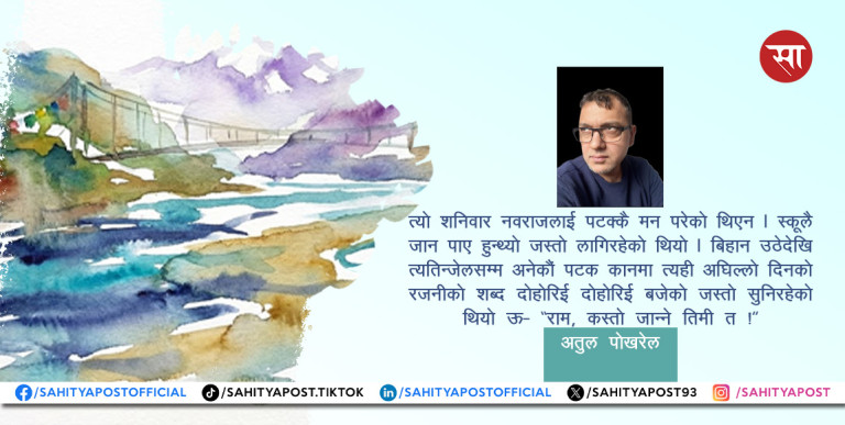 काठमाडौँका वरिपरि र फूल्चौकीडाँडामा सेताम्मै हिँउ परेको थियो । त्यो डाँडामा परेको सेतो हिँउले फेरेको चिसो सास आएर होला शहर पनि चिसै भएको थियो । हामी तराईमा जन्मिएर हुर्केकाहरूलाई त झन् मुटु सम्म नै चिसो हुन्थ्यो । एक दिन राती देखि श्रीमतीलाई असैय्य हुने गरी पेट दुख्न थाल्यो । तातो पानी उमालेर खान दिएँ । हटवाटर ब्यागले पेट सेकिदिएँ । तर कम भएन । बल्ल बल्ल बिहान भए पछि अस्पताल लिएर गएँ । अस्पतालमा पिसाब र रगतको जाँच भयो । आइरनको मात्रा कम भएको रहेछ । कन्स्टिपेसन भएको देखिन्छ । बच्चा जन्मिने हुँदा यो स्वाभाविक हो । ‘ल बधाई छ’ डाक्टरले भने । भिटामिन, मिनरल्स् , प्रोटिन, आदि खानु भनेर डाक्टरले लेखिदिए । पेट खाली नराख्नु त्यसले पेटमा एसिडको मात्रा बढ्छ र पेट दुख्छ भनेर सल्लाह दिए । श्रीमती स्कुलमा बिदा लिएर घरमै बसेकी थिइन् ।