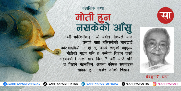 कान्छी ढोकाको संघारमा बसेकी थिई । अहिलेसम्म उसले एक शब्द पनि बोलेकी थिइन । तर, त्यो नौलो आइमाईको कुरालाई उसले जवाफ नदिई रहन सकिन, “के कुरा गर्नु’भा तपाईंले । अर्कालाई यसै पनि चोर दोष लगाउन त पाइँदैन । मैले चोरेको भन्ने परमान के छ ?”