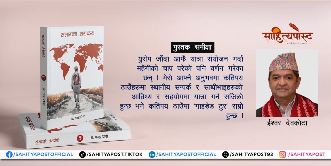 लौ आज ‘संसारको सेरोफेरो’ शयर गरियो ! तदारूप मन्द आनन्द भोग गरियो । लेखक डा. चन्द्र गिरीको यात्रा आफ्नो जन्मस्थल खोटाङको चिमचिमा गाउँबाट शुरू हुँदै विश्वका १ सय २६ देशमा विस्तारित भइसकेको छ, र यात्रा अझै जारी छ । यति भन्दै गर्दा एक स्वाभाविक कौतुहलता उठिहाल्छ : हैन, उनलाई कसरी यति धेरै ठाउँहरू भ्रमण गर्न अनुकूल जुर्यो ?