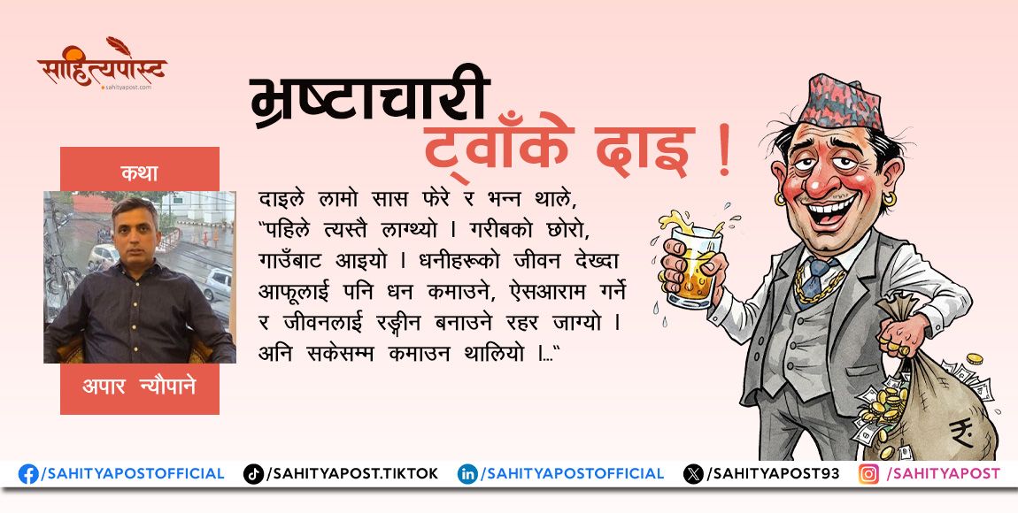 दाइभाउजूको गुनासो हुन्थ्यो, “पैसा कमाउन गाह्रो, कमाउन भन्दा लुकाउन झन् गाह्रो । थोरै भए पो लुकाउनु, बैध श्रोत छैन । अरूलाई राख्न दियो, उसैले खाइदेला भन्ने डर ।” दाइको भ्रष्टाचार कानूनी आँखामा नदेखिए पनि सबैको आँखामा घाम जस्तै झलमल्ल भैसकेको थियो, लुकाउने गुन्जाइसै थिएन ।
