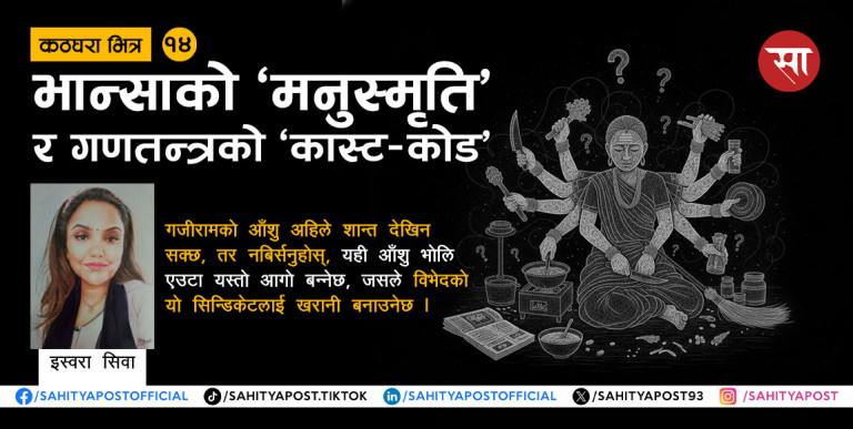 जातव्यवस्थाको सबैभन्दा ठूलो किल्ला संसद् होइन, हाम्रा भान्साहरू हुन् । नेपाली भान्सा खाना पाक्ने ठाउँ मात्र नभएर ‘विभेदको डिएनए’ उत्पादन गर्ने प्रयोगशाला हो । जहाँ एउटा बच्चाले अक्षर चिन्नुअघि नै ‘छोइछिटो’ को व्याकरण सिक्छ । जब एउटी आमाले आफ्नो सन्तानलाई “त्यो मान्छेलाई नछोऊ, अपवित्र भइन्छ” भनेर पहिलो गाँस खुवाउँछिन्, त्यहीँबाट गजीरामहरूलाई रुवाउने ‘सागरकुमार’ हरूको जन्म हुन्छ ।