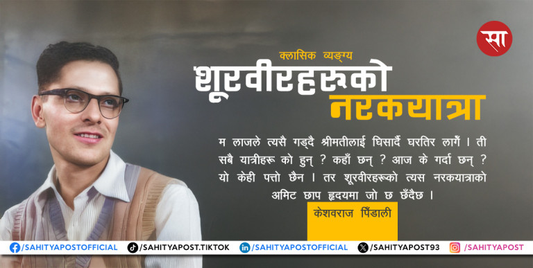 मलाई एक दिन झोंकै चल्यो, दर्जाको पछाडि एउटा ‘टर’ नझुन्डिएको जागिर के खानु ? किनभने जमानै ‘टर’ को छ हेर्नोस् न -मिनिस्टर, डाइरेक्टर, इन्सपेक्टर, मास्टर, डाक्टर, एडिटर, अडिटर इत्यादि । पुलिस इन्सपेक्टर नपाए बस कन्डक्टर नै सही, एडिटर नपाए कम्पोजिटर नै सही, एउटा ‘टर’ त झुन्ड्याउनै पर्छ बा ! यो जाबो बहीदार सधैँको दिक्दार । यस्तै कुरा सोच्तै मकैमार्का बेसनको लड्डु खाएर चुइँचुइँ कराउने साइकिलरुपी छुचुन्द्रोमा गणपति लम्केझैँ ढल्किँदैढल्किँदै हल्लिरहेको थिएँ ! नयाँसडकको मूल ढोकैमा प्रसिद्ध नेता कछुवाकान्त कार्की भेट भए । साइकिलबाट ओर्ह्लंदै नमस्कारपूर्वक मैले सोधेँ- “नेताजी कता ?”